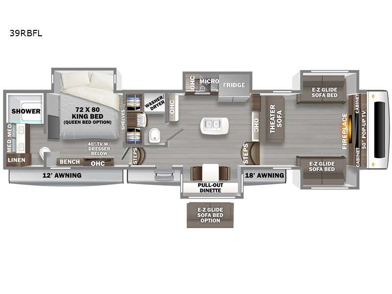 - Separate Living Room: Enjoy a cozy front living area with opposing E-Z glide sofa beds, a theater sofa, and a 50" pop-up TV.