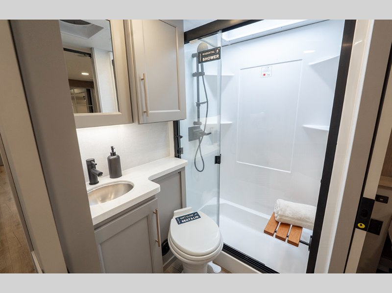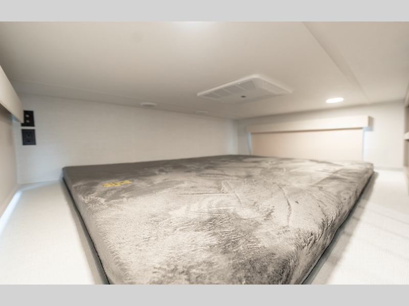The Benchmark 8' 5" wide-body chassis, Mylar reinforced exterior seals, and insulated laminated rear wall will provide a durable fifth wheel made to last. There is a TSC - Touring Coil Suspension and Curt 8,000 lb. axles for the ultimate towing experience, and the 6-point hydraulic leveling will make set-up easier than ever. Head inside to find bronze hardware, atrium windows, a large residential shower, and roller shades throughout to provide privacy when you want it.