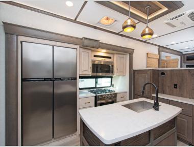 An active family will want this fifth wheel with its 48" x 115" exterior basement pull-out tray for kayaks or extra storage. Just above this area is the master suite with a rear bathroom that offers a residential shower, a porcelain toilet with soft close seat, plus a wardrobe and shelf storage. The king bed slide gives you more floor space, and you will have a seat, a flip-top dresser, and a Smart TV to watch movies in bed. The half bath is next to the main entry which is super convenient, and the middle kitchen is separate from the front living area. The cook will love the residential microwave, range and oven, plus the 19 cu. ft. 12 volt residential refrigerator. There is also a pantry and extra counter space on the kitchen island with a large sink. The views out of the atrium windows in the slide out, which includes the swivel table and desk, are a must see. And when you need to watch the big game, the 55" Smart TV with a pull-out fireplace storage are up front with the dual recliner love seat and two sleeper sofas.