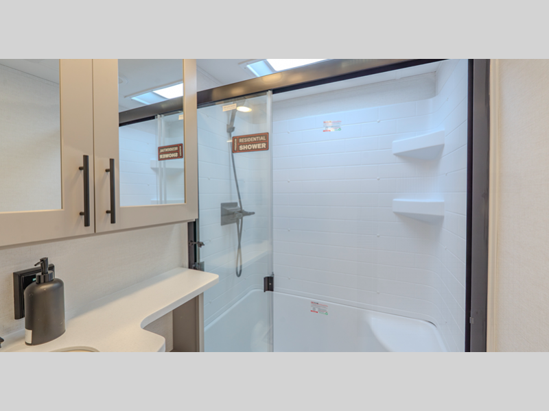 The 101" wide-body benchmark chassis provides plenty of space to bring along the dirt bikes, four-wheeler, or kayaks, and the Azdel-backed fiberglass sidewalls are ultra durable so you can enjoy your RV for years to come. You will appreciate the Garage Management System that includes a weather resistant ramp door, a fully insulated garage floor, and a multi-point tie-down system to keep your toys secure during transport. The interior will have you feeling at home with black cabinetry hardware, residential LED recessed ceiling lights, a large residential shower, and many more comforts.