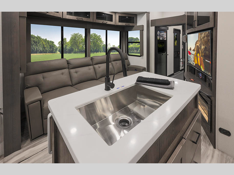 Sleeps 8 Slides 3 Length 40 ft 11 in Ext Width 8 ft 5 in Ext Height 13 ft 5 in Exterior Color Standard Paint/Graphics. Full Body Paint Options; Blue, Silver Hitch Weight 2993 lbs GVWR 18000 lbs Dry Weight 14695 lbs Fresh Water Capacity 98 gals Grey Water Capacity 106 gals Black Water Capacity 93 gals Tire Size 17.5" Furnace BTU 40500 btu Fuel Capacity 60 gals Number Of Bunks 1 Available Beds King Refrigerator Type 12V Cooktop Burners 4 Shower Size 48" x 30" Number of Awnings 2 Axle Weight 8000 lbs Garage Size 11 ft TV Info LR 65" HDTV, BR 32" TV, Garage 40" TV Axle Count 2 Washer/Dryer Available Yes Shower Type Standard Electrical Service 50 amp Similar Floorplans