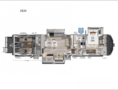 Sleeps 8 Slides 3 Length 40 ft 3 in Ext Width 8 ft 5 in Ext Height 13 ft 4 in Interior Color Sahara Exterior Color Optional Full-Body Paint; Silver & Black, White & Black, Gold & Black, Metallic Hitch Weight 3150 lbs GVWR 22000 lbs Dry Weight 17496 lbs Fresh Water Capacity 150 gals Grey Water Capacity 156 gals Black Water Capacity 85 gals Tire Size 215/75 R17.5 Furnace BTU 35000 btu Generator FlexPower 5500 Fuel Capacity 60 gals Number Of Bunks 1 Available Beds King Refrigerator Type GE Energy Star with Ice Maker and Filtered Water Refrigerator Size 19 cu ft Convection Cooking Yes Cooktop Burners 4 Shower Size 30" x 42" Number of Awnings 4 Axle Weight 7000 lbs Garage Size 11 ft LP Tank Capacity 30 lbs Water Heater Type Tankless AC BTU 40500 btu TV Info LR 50" Smart TV, Garage 43" Smart TV, BR 32" Smart TV Awning Info 9', 10' 6", 15', and Rear Patio Power w/Neon Lights Axle Count 3 Washer/Dryer Available Yes Number of LP Tanks 2 Shower Type Standard Electrical Service 50 amp Solar Wattage 800 watts Similar Toy Hauler Fifth Wheel Floorplans