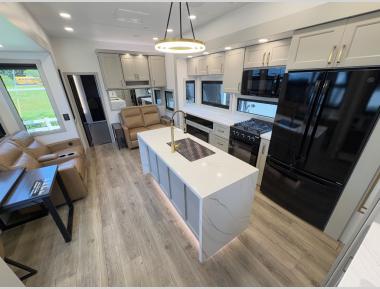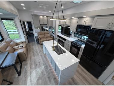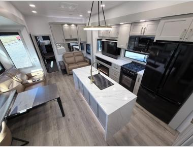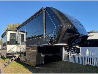 Sleeps 4 Slides 3 Length 45 ft 11 in Ext Width 8 ft 5 in Ext Height 13 ft 4 in Interior Color Sahara Exterior Color Optional Full-Body Paint; Silver & Black, White & Black, Gold & Black, Metallic Hitch Weight 3450 lbs GVWR 23000 lbs Dry Weight 18600 lbs Fresh Water Capacity 150 gals Grey Water Capacity 156 gals Black Water Capacity 85 gals Tire Size 215/75 R17.5H Furnace BTU 35000 btu Generator FlexPower 5500 Fuel Capacity 60 gals Number Of Bunks 1 Available Beds King Refrigerator Type GE Energy Star with Ice Maker and Filtered Water Refrigerator Size 19 cu ft Convection Cooking Yes Cooktop Burners 4 Shower Size 30" x 42" Number of Awnings 4 Axle Weight 7000 lbs Garage Size 12 ft 6 in LP Tank Capacity 30 lbs Water Heater Type Tankless AC BTU 40500 btu TV Info LR 50" Smart TV & Televator, Garage 43" Smart TV, BR 32" Smart TV Awning Info 10' 6", 15', 14' 6" and Rear Power w/Neon Lights Axle Count 3 Washer/Dryer Available Yes Number of LP Tanks 2 Shower Type Standard Electrical Service 50 amp Solar Wattage 800 watts Similar Toy Hauler Fifth Wheel Floorplans