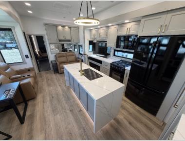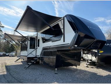 Sleeps 7 Slides 3 Length 46 ft 11 in Ext Width 8 ft 5 in Ext Height 13 ft 4 in Interior Color Sahara Exterior Color Optional Full-Body Paint; Silver & Black, White & Black, Gold & Black, Metallic GVWR 23000 lbs Fresh Water Capacity 150 gals Grey Water Capacity 156 gals Black Water Capacity 85 gals Tire Size 215/75 R17.5 Furnace BTU 35000 btu Generator FlexPower 5500 Fuel Capacity 60 gals Number Of Bunks 1 Available Beds King Refrigerator Type GE Energy Star with Ice Maker and Filtered Water Refrigerator Size 19 cu ft Convection Cooking Yes Cooktop Burners 4 Shower Size 30" x 42" Number of Awnings 4 Axle Weight 7000 lbs Garage Size 10 ft 6 in LP Tank Capacity 30 lbs Water Heater Type Tankless AC BTU 40500 btu TV Info LR 50" Smart TV, Garage 43" Smart TV, BR 32" Smart TV Awning Info 10' 6", 15', 15' 6", and Rear Patio Power w/Neon Lights Axle Count 3 Washer/Dryer Available Yes Number of LP Tanks 2 Shower Type Standard Electrical Service 50 amp Solar Wattage 800 watts Similar Toy Hauler Fifth Wheel Floorplans