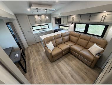 Featuring a spacious L-sofa with four recliners and a 65” articulating TV for endless entertainment, this fifth wheel is a great option to get on the road! The convertible dining table/L desk seats up to four people, making it perfect for meals, work, or play. You can cozy up by the fireplace and enjoy quality time with loved ones. Plus, ample shoe storage keeps your gear organized. The kitchen is equipped with solid surface countertops, dishwasher prep, a residential microwave, and a three-burner cooktop. Also, the large pantry with pull-out drawers provides ample storage for your favorite ingredients and cooking essentials. The one-piece fiberglass shower is a highlight of the bathroom, offering a convenient space to get ready, and additional storage is provided by the linen closet. And you will love the front main bedroom featuring a residential queen memory foam mattress with nightstands, outlets, and USB & USB-C ports for convenient charging.