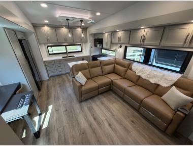 Escape to a world of comfort and luxury with this incredible fifth wheel! The living area features a plush L-sofa, five recliners, and a warm fireplace. The versatile dining table/L desk seats up to four people, making it perfect for meals, work, or play. Ample shoe storage and a convenient spot for pet bowls enhance comfort and practicality. The kitchen offers stunning solid surface countertops, dishwasher prep, a residential microwave, and a three-burner cooktop. The expansive pantry with pull-out drawers provides ample storage for your favorite ingredients and cooking essentials. The full bathroom is a serene oasis, featuring a linen closet for added storage and convenience. The front bedroom is a peaceful sanctuary, featuring a spacious king bed, shelves, and a sliding dresser top with hidden storage. The generous wardrobe and shoe rack provide ample storage for your clothes and shoes.