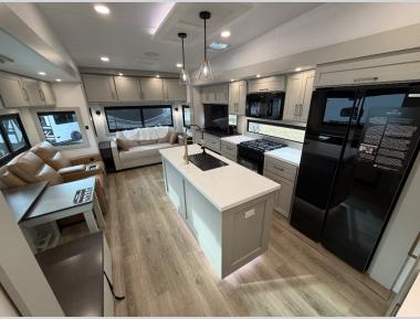 Sleeps 4 Slides 3 Length 38 ft 11 in Ext Height 13 ft 4 in Int Height 6 ft 8 in Fresh Water Capacity 150 gals Grey Water Capacity 128 gals Black Water Capacity 45 gals Tire Size 215/75 R17.5 Furnace BTU 35000 btu Available Beds King Refrigerator Type 12V Energy Efficient Refrigerator Size 16 cu ft Cooktop Burners 3 Number of Awnings 2 Axle Weight 8000 lbs LP Tank Capacity 30 lbs. Water Heater Type Tankless On Demand AC BTU 45000 btu TV Info LR 50" Telescoping TV, BR 32" Smart TV Awning Info 11' & 18' w/LED Lighting Axle Count 2 Washer/Dryer Available Yes Number of LP Tanks 2 Shower Type Standard Similar Fifth Wheel Floorplans