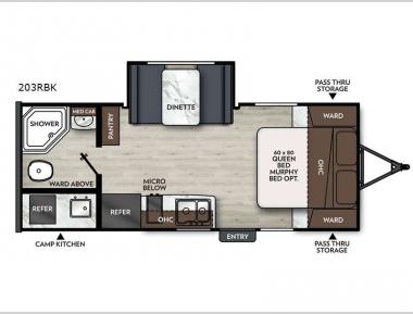 When you camp at RV parks, state parks or local campgrounds, you will love the easy setup after towing the trailer to your destination! The booth dinette slide and the power awning with LED lighting can quickly be set up so you can relax and unwind with your favorite person or people. You will have the choice of cooking inside with full amenities or outdoors on the outside kitchen, inside you will have a pantry to store all your dry goods and an air fryer microwave to heat up items. The rear bathroom includes a wardrobe and allows you privacy when inside, and the front walk-around queen-size bed or the Murphy bed option, allows you to sleep comfortably after hiking, walking or fishing. There are wardrobes at either side to allow for storing your clothes and essentials. And you will find more storage throughout for your clothing, plates, games and such, plus outside in the pass-through compartment.