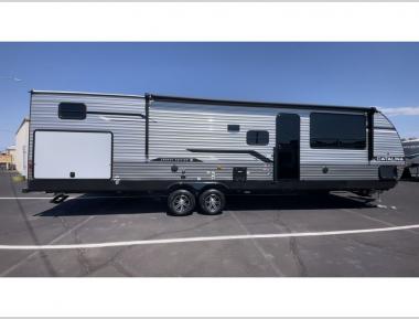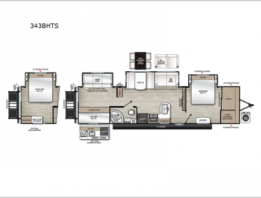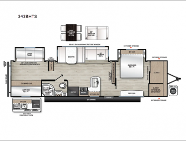 Sleeps 8 Slides 3 Length 38 ft 4 in Ext Width 8 ft Ext Height 11 ft 3 in Int Height 6 ft 9 in Hitch Weight 1252 lbs GVWR 10800 lbs Dry Weight 8620 lbs Cargo Capacity 2180 lbs Fresh Water Capacity 44 gals Grey Water Capacity 70 gals Black Water Capacity 30 gals Furnace BTU 35000 btu Number Of Bunks 2 Available Beds Queen Refrigerator Type 12V Refrigerator Size 10 cu ft Cooktop Burners 3 Shower Size 34" x 34" Number of Awnings 1 LP Tank Capacity 20 lbs Water Heater Capacity 6 gal Water Heater Type Gas/Electric DSI AC BTU 13500 btu Awning Info 21' Electric w/Multicolor LED Strip & Remote Axle Count 2 Washer/Dryer Available Yes Number of LP Tanks 2 Shower Type Radius Electrical Service 30 amp Similar Travel Trailer Floorplans