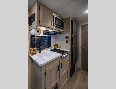 This travel trailers is perfect for a young family or smaller group. You can easily sleep four or more with the rear set of bunk beds and queen bed up front. There is also a booth dinette for inside down-time, as well as complete kitchen and bath amenities so you can cook and stay clean while traveling. The rear corner bath features a toilet and 36" x 30" shower, and it's conveniently located next to the bunk beds which is great for little ones at night. Cooking inside will be easy with a GE stainless two-burner cooktop and single sink, plus there is also a GE microwave oven for snacks and things that you can easily warm up. If you plan to spend most of your time outdoors, you will find plenty of storage space in the front exterior storage compartment, and there is also plenty of storage inside as well.