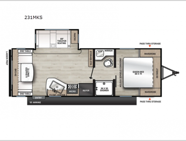 Sleeps 4 Slides 1 Length 28 ft 2 in Ext Width 8 ft Ext Height 11 ft 1 in Int Height 6 ft 9 in Hitch Weight 730 lbs GVWR 7206 lbs Dry Weight 5706 lbs Cargo Capacity 1500 lbs Fresh Water Capacity 38 gals Grey Water Capacity 44 gals Black Water Capacity 28 gals Furnace BTU 35000 btu Available Beds Queen Refrigerator Type 12V GE Stainless Refrigerator Size 10.7 cu ft Cooktop Burners 3 Shower Size 36" x 30" Number of Awnings 1 LP Tank Capacity 20 lbs Water Heater Type Tankless On Demand AC BTU 13500 btu Awning Info 18' Electric w/Multicolored LED Light Strip and Remote Axle Count 2 Number of LP Tanks 2 Shower Type Standard Electrical Service 30 amp Similar Travel Trailer Floorplans