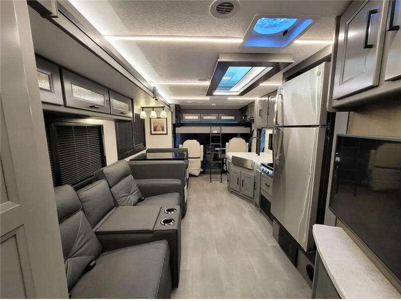 Sleeps 8 Slides 2 Length 38 ft 2 in Ext Width 8 ft 6 in Ext Height 12 ft 7 in Interior Color Chiffon, Sandcastle Exterior Color Std. Partial Paint or Full Body Options: Barcelona, Madrid, Millan, Vienna. Hitch Weight 8000 lbs GVWR 22000 lbs Fresh Water Capacity 70 gals Grey Water Capacity 90 gals Black Water Capacity 90 gals Tire Size 22.5" Furnace BTU 35000 btu Generator 5.5kw Gas Fuel Type Gasoline Engine 7.3L V8 Chassis Ford F53 Fuel Capacity 80 gals Wheelbase 242 in Number Of Bunks 2 Available Beds King Refrigerator Type Stainless Steel Residential Cooktop Burners 3 Shower Size 38" x 30" Number of Awnings 1 Axle Weight Front 8000 lbs Axle Weight Rear 15000 lbs LP Tank Capacity 20 gals Water Heater Type On Demand TV Info LR 40" Smart TV, BR 32" LCD TV, Ext. 40" TV Awning Info 20' Power Washer/Dryer Available Yes Gross Combined Weight 26000 lbs Shower Type Standard Electrical Service 50 amp Similar Floorplans