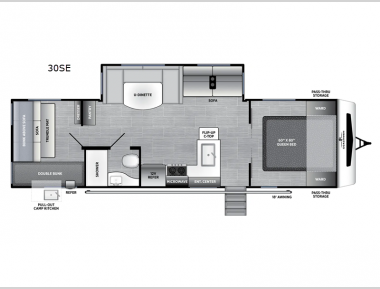 Sleeps 11 Slides 1 Length 33 ft 3 in Ext Width 8 ft Ext Height 11 ft 3 in Int Height 6 ft 9 in Hitch Weight 770 lbs GVWR 9900 lbs Dry Weight 6742 lbs Cargo Capacity 3158 lbs Fresh Water Capacity 52 gals Grey Water Capacity 35 gals Black Water Capacity 35 gals Number Of Bunks 3 Available Beds Queen Bed Refrigerator Type 12V Refrigerator Size 10 cu ft Cooktop Burners 3 Number of Awnings 1 Water Heater Type Suburban Tankless AC BTU 15000 btu TV Info 40” Smart TV Awning Info 18' Velarium Velocity Switch Power Awning w/ Light Strip Axle Count 2 Shower Type Standard Similar Travel Trailer Floorplans