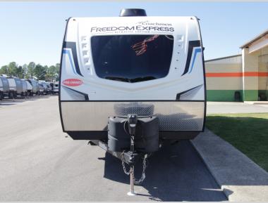 With any Freedom Express Ultra Lite travel trailer by Coachmen you will appreciate quality construction materials, such as vacuum bonded walls with Azdel composite, a 3/4 gel coated fiberglass cap with an automotive glass windshield, and a heated enclosed underbelly. Each model also features Tufflex PVC roofing, front rock guard, and E-Z Lube axles for smooth towing. Inside, you'll find kitchen backsplash, hidden hinge cabinetry, and wear-resistant vinyl flooring throughout. The power tongue jack included with the Ultra Lite Express Package will make set-up a breeze, and each model includes back-up camera prep and they are Freedom solar ready if you plan to go off-grid. Enjoy lightweight camping with a Freedom Express Ultra Lite travel trailer today!