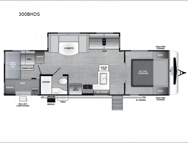 Sleeps 7 Slides 1 Int Height 6 ft 9 in Number Of Bunks 2 Available Beds Queen Refrigerator Type 12V Magic Chef Double Door Refrigerator Size 10 cu ft Cooktop Burners 3 Number of Awnings 1 Water Heater Type Tankless AC BTU 15000 btu TV Info Smart TV Awning Info 18' Power with LED Lights Axle Count 2 Shower Type Standard Solar Wattage 200 watts Similar Travel Trailer Floorplans