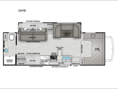 There is versatility found all throughout this motorhome! Starting with the 72" x 74" Murphy bed that offers a comfortable place to sleep and can convert into a 84" sofa to sit on during the day. Across from it is a 40" Smart TV with an optional fireplace below it plus optional washer and dryer ready. The 57" x 80" bunk over cab offers additional sleeping or storage space, and you could even transform the 44" x 82" U-shaped dinette into an extra sleeping space. The fully equipped kitchen has a pull-out countertop extension to make meal prepping easier and there is even an outside kitchen so you can cook dinner in the great outdoors!
