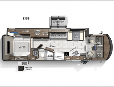 You and your family will be fascinated with this motor home. Perfect for family and guests due to its plenty of room to sleep, like the 70" x 74" king bed for a couple, 78" sofa with bed for kids and the 47" x 81" overhead bunk where two more people can easily fit. This unit is equipped with all the facilities need for a comfortable ride starting with a full bathroom with a 30" x 36" shower, interior kitchen with fridge, farm sink, three cooktop burners, microwave and a 42" x 76" dinette ideal to eat the dinner comfortably. You can also have relaxing and entertaining time whether watching the TV in the living room while enjoying the fireplace or in the 32" bedroom LED TV. In this motorhome, you will also find plenty of space to store your stuff in diverse parts, like wardrobe, dresser, and overhead cabinets in the bedroom area, as well as linen/ pantry and overhead cabinets in the kitchen area. Finally, enjoy the nicest meals in the outdoor kitchen, allowing you to have a great time having food while admiring the surroundings.