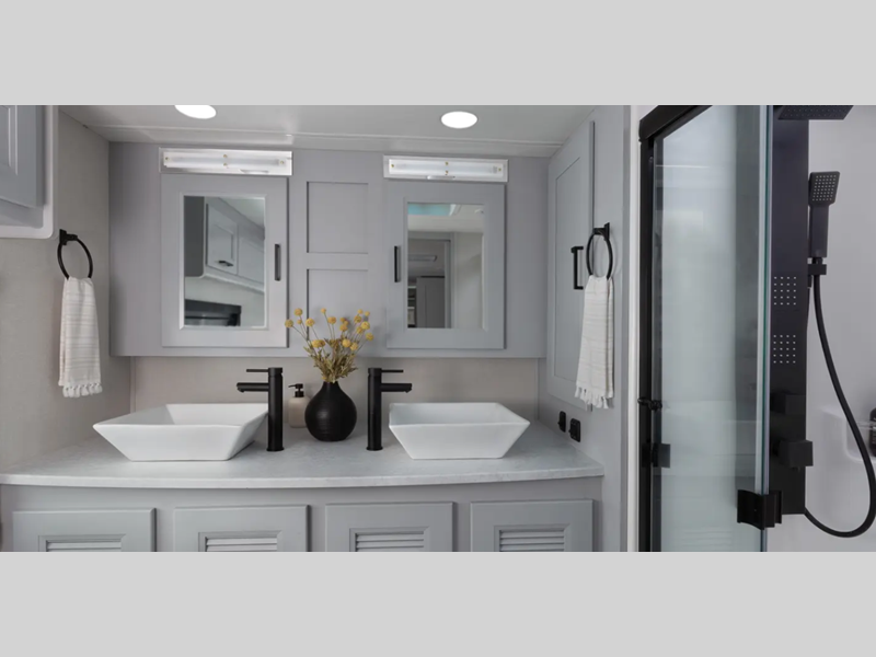 Sleeps 7 Slides 3 Length 41 ft 1 in Ext Width 8 ft 6 in Ext Height 12 ft 10 in Interior Color Chiffon, Sandcastle Exterior Color Red Rock Canyon Full Body Paint, Royal Gorge, Waimea Canyon Hitch Weight 10000 lbs GVWR 32000 lbs Fresh Water Capacity 89 gals Grey Water Capacity 104 gals Black Water Capacity 52 gals Tire Size 22.5" Furnace BTU 40000 btu Generator 8.0kW Diesel Fuel Type Diesel Engine ISB Cummins Rear Diesel Chassis Raised Rail Freightliner Horsepower 360 hp Fuel Capacity 100 gals Wheelbase 266 in Number Of Bunks 2 Available Beds King Torque 800 ft-lb Refrigerator Type Residential Stainless Steel Cooktop Burners 2 Shower Size 38" x 26", 38" x 30" Number of Awnings 1 Axle Weight Front 12000 lbs Axle Weight Rear 20000 lbs LP Tank Capacity 84 lbs Water Heater Type On Demand AC BTU 30000 btu TV Info LR 50" Smart TV, BR 32" Smart TV, Ext. TV Awning Info 18' Power Washer/Dryer Available Yes Gross Combined Weight 42000 lbs Shower Type Standard Electrical Service 50 amp Similar Floorplans