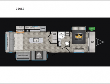 This spacious travel trailer is beaming with luxurious features you are sure to love. The dual opposing slides in the main living area open up the whole space, plus there is a third slide out in the front master suite. The chef of the family will appreciate the kitchen island for additional counter space, and there is a large pantry for all your non-perishables. This space has also been prepped to add an optional washer and dryer if you choose. Your family will find plenty of seating space on the rear 82" tri-fold sofa, the XL booth dinette, and the theater seating. The dual entry bath creates a front master bedroom, and you'll find plenty of storage space here, including a chest of drawers and a large front shelf!