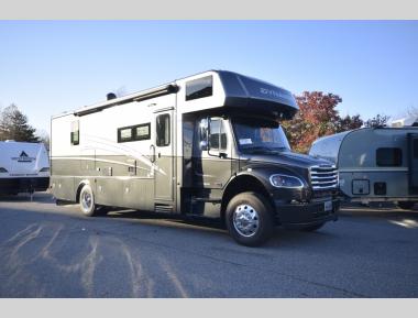 Sleeps 5 Slides 2 Length 33 ft 5 in Ext Width 8 ft 5 in Ext Height 12 ft 9 in Interior Color Desert, Milano, Crescent (Dealer Stock Only) Exterior Color Admiral Blue, Khaki, Merlot, Quicksilver, Stone Ridge Hitch Weight 12000 lbs GVWR 33000 lbs Fresh Water Capacity 94 gals Grey Water Capacity 52 gals Black Water Capacity 52 gals Tire Size 275/80R 22.5 Furnace BTU 40000 btu Generator 8kW Onan Diesel Fuel Type Diesel Engine Cummins B6.7 Turbo Diesel Chassis Freightliner M2 106B Plus Horsepower 360 hp Fuel Capacity 100 gals Wheelbase 245 in Available Beds King Torque 800 ft-lb Refrigerator Type Residential w/Ice Maker Refrigerator Size 16 cu ft Convection Cooking Yes Cooktop Burners 3 Shower Size 36" x 36" Number of Awnings 1 Axle Weight Front 12000 lbs Axle Weight Rear 21000 lbs LP Tank Capacity 20.3 gals Water Heater Type On Demand LP AC BTU 30000 btu TV Info LR 39" LED Smart TV, BR 32" LED Smart TV, Ext. 32" LED Smart TV Awning Info 16' Armless w/LED Lighting and Motion Activated Retraction Washer/Dryer Available Yes Gross Combined Weight 46000 lbs Shower Type Standard Electrical Service 50 amp Similar Motor Home Super C - Diesel Floorplans