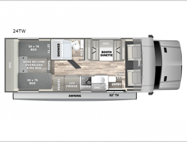 As soon as you step inside this motorhome, you're welcomed by a cozy booth dinette that perfect for enjoying meals or simply relaxing after a day on the road. Directly across, the well-equipped kitchen features all the essentials, including a 12V 8 cu. ft. refrigerator to keep your groceries fresh, a gas range with a glass cover, a convection microwave oven, and a solid surface countertop extension that adds valuable prep space. Adjacent to the dinette is the bathroom, complete with a standard shower enhanced by an Oxygenics Body Spa RV shower head and a skylight for added comfort and natural light, along with a convenient foot-flush toilet. At the rear, you'll find two 30" x 76" beds that can easily convert into an oversized king bed, offering flexible sleeping arrangements. To top it all off, a 32" LED Smart TV lets you unwind with your favorite shows, making this motorhome a true home on wheels.