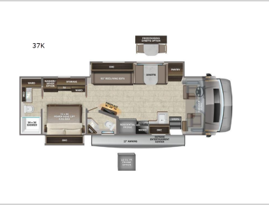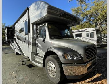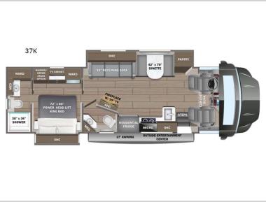 Sleeps 6 Slides 2 Length 39 ft 4 in Ext Width 8 ft 5 in Ext Height 13 ft 4 in Int Height 7 ft Interior Color Brookside, Farmhouse Exterior Color Afternoon, Daybreak, Dusk, Midday, Moonless Night, White Night Hitch Weight 12000 lbs GVWR 31000 lbs Fresh Water Capacity 72 gals Grey Water Capacity 91 gals Black Water Capacity 63 gals Tire Size 275/80R 22.5 Furnace BTU 30000 btu Generator 8,000W Diesel Fuel Type Diesel Engine Cummins ISB 6.7L Chassis Freightliner S2RV Horsepower 360 hp Fuel Capacity 100 gals Wheelbase 279 in Number Of Bunks 1 Available Beds King Torque 800 ft-lb Refrigerator Type Residential Convection Cooking Yes Cooktop Burners 2 Shower Size 30" x 36" Number of Awnings 1 Axle Weight Front 10000 lbs Axle Weight Rear 21000 lbs LP Tank Capacity 24.5 gals Water Heater Type Suburban tankless AC BTU 30000 btu TV Info LR 39" LED HD Smart TV, BR LED HD Smart TV, Ext. LED HD Smart TV Awning Info 17' Electric w/ LED Lights Washer/Dryer Available Yes Gross Combined Weight 43000 lbs Shower Type Standard Electrical Service 50 amp Solar Wattage 200 watts Similar Motor Home Super C - Diesel Floorplans