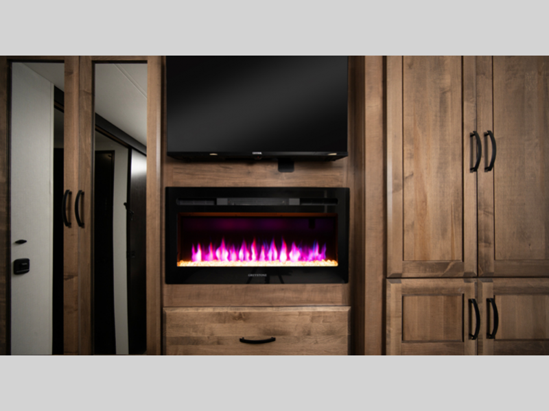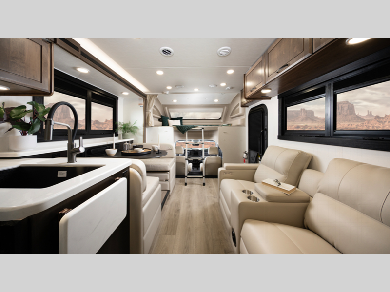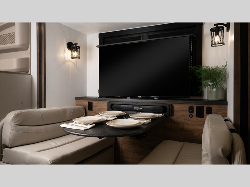 The E-Z Drive Premier provides a computer-balanced driveshaft, front and rear heavy-duty stabilizer bars, and Koni shocks so you will be riding in comfort. An 84" interior ceiling height gives you plenty of room to walk around, and the overhead bunk has a 750-lb. capacity so it will easily sleep two adults. You'll get around easily while listening to your favorite music with the Ford® SYNC® 4 infotainment center. And Smart TVs in the bedroom, living area, and exterior entertainment center mean you can stream your favorite shows while on the go.