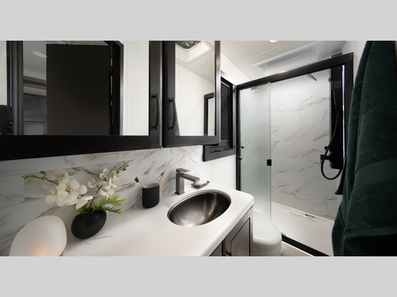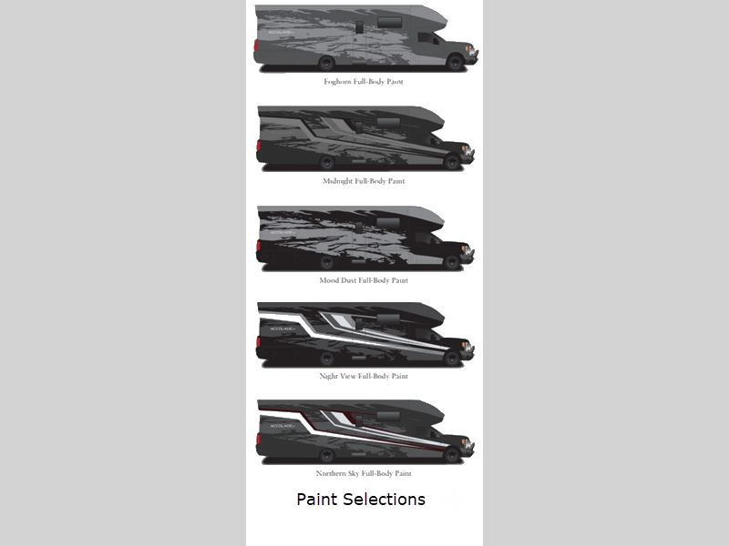 Sleeps 4 Length 29 ft 10 in Ext Width 8 ft 5 in Ext Height 12 ft 6 in Int Height 7 ft Interior Color Cold Spring, Warm River Exterior Color Full-Body Paint Options; Foghorn, Midnight Lighting, Mood Dust, Night View, Northern Sky Hitch Weight 12000 lbs GVWR 19500 lbs Fresh Water Capacity 72 gals Grey Water Capacity 43 gals Black Water Capacity 43 gals Tire Size 225/70R19.5 Furnace BTU 30000 btu Generator 6,000W Diesel Fuel Type Diesel Engine 6.7L Power Stroke V8 Chassis Ford F550 4X4 Horsepower 330 hp Fuel Capacity 67 gals Wheelbase 205 in Number Of Bunks 1 Torque 950 ft-lb Refrigerator Type 12V Refrigerator Size 10 cu ft Convection Cooking Yes Cooktop Burners 2 Shower Size 26" x 36" Number of Awnings 1 Axle Weight Front 7000 lbs Axle Weight Rear 14706 lbs LP Tank Capacity 24.5 gal. Water Heater Type Tankless AC BTU 28500 btu TV Info LED HD Smart TV; LR 50" TV, Ext. TV Awning Info 18' Electric Legless with LED Lights Gross Combined Weight 31500 lbs Shower Type Standard Electrical Service 50 amp Similar Floorplans