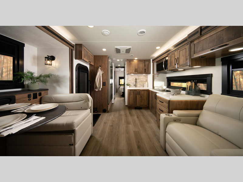 Sleeps 6 Slides 2 Length 34 ft 2 in Ext Width 8 ft 5 in Ext Height 12 ft 6 in Int Height 7 ft Interior Color Cold Spring, Warm River Exterior Color Full-Body Paint Options; Foghorn, Midnight Lighting, Mood Dust, Night View, Northern Sky Hitch Weight 12000 lbs GVWR 22000 lbs Fresh Water Capacity 60 gals Grey Water Capacity 38 gals Black Water Capacity 30 gals Tire Size 245/70R19.5 Furnace BTU 30000 btu Generator 6,000W Diesel Fuel Type Diesel Engine 6.7L Power Stroke V8 Chassis Ford F600 4X4 Horsepower 330 hp Fuel Capacity 67 gals Wheelbase 227 in Number Of Bunks 1 Available Beds King Torque 950 ft-lb Refrigerator Type Residential Refrigerator Size 18 cu ft Convection Cooking Yes Cooktop Burners 2 Shower Size 30" x 36" Number of Awnings 1 Axle Weight Front 7500 lbs Axle Weight Rear 15500 lbs LP Tank Capacity 24.5 gal. Water Heater Type Tankless AC BTU 28500 btu TV Info LED HD Smart TV; LR 50" Lift TV, BR TV, Ext. TV Awning Info 20' Electric Legless with LED Lights Gross Combined Weight 34000 lbs Shower Type Standard Electrical Service 50 amp Similar Floorplans
