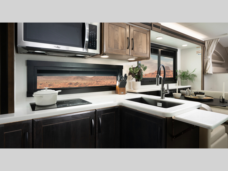 - LED-lit, solid-surface kitchen countertops; Pull-out countertop extension (select models)