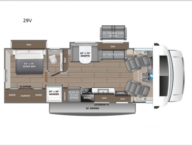 Enjoy a home on wheels with this motorhome! The rear private bedroom has a 60" x 74" queen bed slide to lay your head on at night and dual wardrobes opposite to keep your clothes looking their best. Add the optional TV if you enjoy watching a movie in bed. The separated bathroom makes it easy for one person to freshen up in the 30" x 36" shower while another uses the private toilet and sink. Prepare your best home cooked meals with the Furrion all-in-one cooktop and oven then enjoy them at the booth dinette. The tri-fold sofa offers a comfortable place to relax but it can be switched out for the an optional theater sofa instead. There is also a bunk over cab for more to join in on the fun!