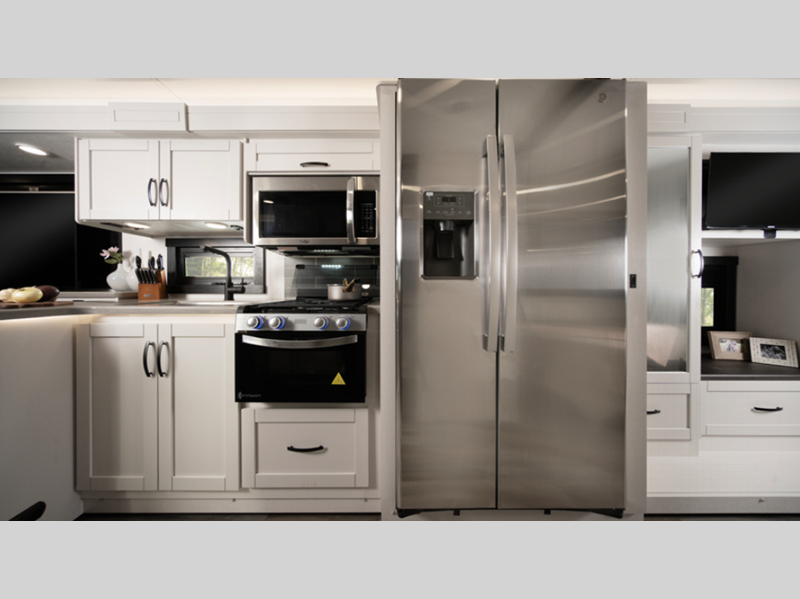 The E-Z Drive Elite comes with a computer balanced driveshaft, heavy-duty front and rear stabilizer bars, Koni shocks, and more so you can be sure to safely arrive at each destination. A Ford F53 chassis and TuffShell vacuum-bond laminated floors and sidewalls hold them together, and the new fiberglass color with updated graphics is sure to be eye catching. Inside, you'll enjoy LED-lit solid surface countertops, a residential refrigerator, hardwood cabinet doors and drawer fronts, and more luxury features to make you feel right at home.
