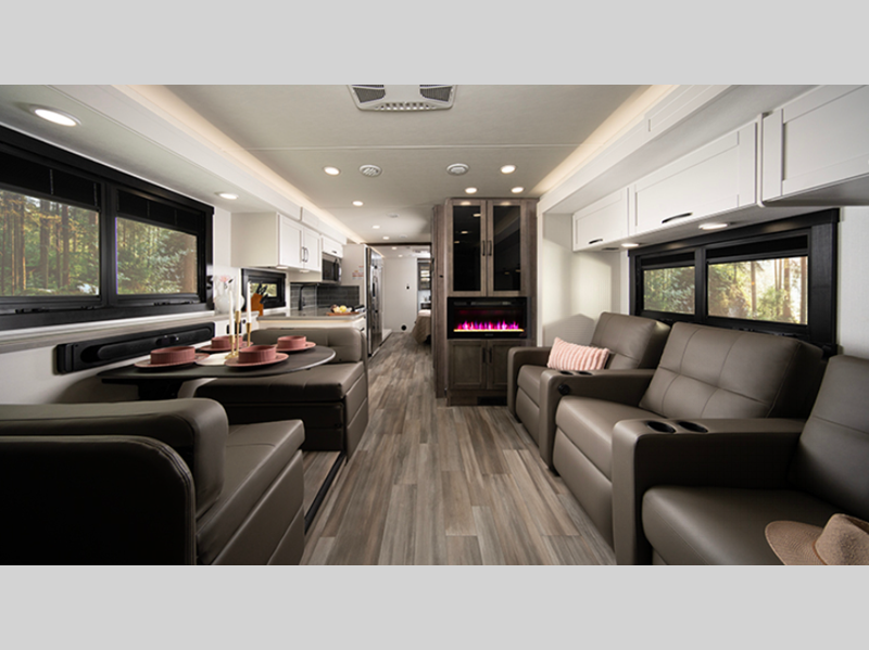 Sleeps 5 Slides 2 Length 36 ft 6 in Ext Width 8 ft 5 in Ext Height 12 ft 10 in Int Height 7 ft Interior Color Benton, Farmhouse Exterior Color Standard Graphics. Full-Body Paint; Glacier Blue, Harbor Grey, Lava Rock, Thunder Hitch Weight 5000 lbs GVWR 22000 lbs Fresh Water Capacity 72 gals Grey Water Capacity 73 gals Black Water Capacity 50 gals Tire Size 22.5" Furnace BTU 30000 btu Generator 5,500-watt with Auto-Gen Start Fuel Type Gas Engine 7.3L V8 Chassis Ford F53 Horsepower 335 hp Fuel Capacity 80 gals Wheelbase 238 in Available Beds RV King Torque 468 ft-lb Refrigerator Type Residential Cooktop Burners 3 Shower Size 30" x 36" Number of Awnings 1 Axle Weight Front 8000 lbs Axle Weight Rear 15000 lbs LP Tank Capacity 16.5 gals Water Heater Type Tankless AC BTU 28500 btu TV Info LR 50" LED HD Smart TV on Lift, BR LED HD Smart TV, Ext. LED HD Smart TV Awning Info 23' Electric with LED Lights Washer/Dryer Available Yes Gross Combined Weight 26000 lbs Shower Type Standard Electrical Service 50 amp Similar Floorplans