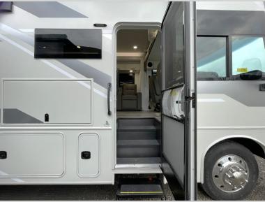 Sleeps 7 Slides 3 Length 38 ft 10 in Ext Width 8 ft 5 in Ext Height 12 ft 10 in Int Height 7 ft Interior Color Benton, Farmhouse Exterior Color Standard Graphics. Full-Body Paint; Glacier Blue, Harbor Grey, Lava Rock, Thunder Hitch Weight 5000 lbs GVWR 24000 lbs Fresh Water Capacity 72 gals Grey Water Capacity 80 gals Black Water Capacity 102 gals Tire Size 22.5" Furnace BTU 30000 btu Generator 5,500-watt Fuel Type Gas Engine 7.3L V8 Chassis Ford F53 Horsepower 335 hp Fuel Capacity 80 gals Wheelbase 252 in Number Of Bunks 2 Available Beds King Torque 468 ft-lb Refrigerator Type Residential Cooktop Burners 3 Shower Size 32" x 32" Number of Awnings 1 Axle Weight Front 9000 lbs Axle Weight Rear 15000 lbs LP Tank Capacity 16.5 gals Water Heater Type Tankless AC BTU 28500 btu TV Info LR 39" LED HD Smart TV, BR LED HD Smart TV, Ext. LED HD Smart TV Awning Info 12' Electric with LED Lights Washer/Dryer Available Yes Gross Combined Weight 30000 lbs Shower Type Radius Electrical Service 50 amp Similar Motor Home Class A Floorplans