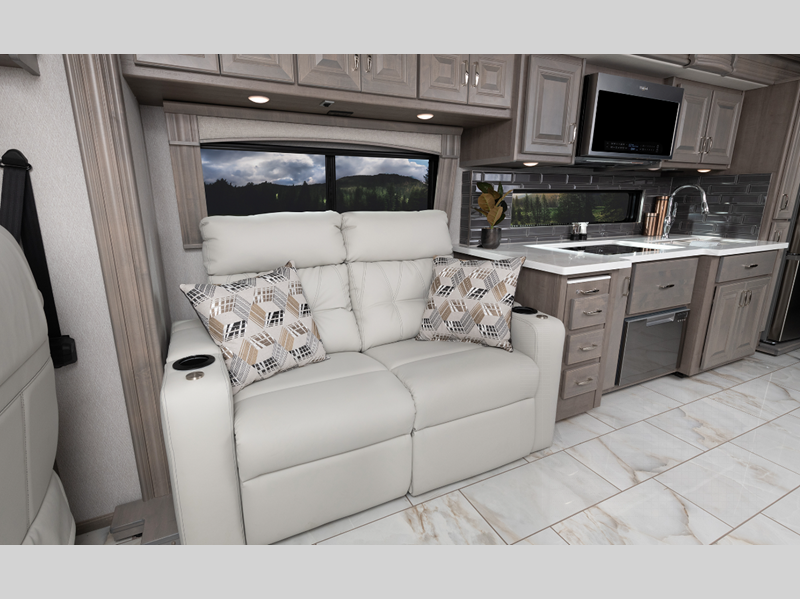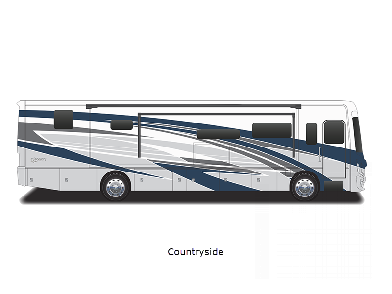 Sleeps 8 Slides 3 Length 38 ft 8 in Ext Width 8 ft 6 in Ext Height 12 ft 10 in Int Height 7 ft Interior Color Amaretto, Serenity, Anthology Exterior Color Countryside, Foundry, Gotham, Lakehouse, Reflection, Retreat, Tempest Hitch Weight 10000 lbs Fresh Water Capacity 105 gals Grey Water Capacity 75 gals Black Water Capacity 50 gals Fuel Type Diesel Engine Cummins B6.7 Chassis Freedom Bridge Freightliner XCM Series Horsepower 360 hp Fuel Capacity 100 gals Wheelbase 252 in Number Of Bunks 2 Available Beds King Torque 800 ft-lb Refrigerator Type Residential Convection Cooking Yes Cooktop Burners 2 Shower Size 50" x 28" Number of Awnings 2 Axle Weight Front 12600 lbs Axle Weight Rear 21000 lbs Water Heater Type Aqua Hot 400 AC BTU 45000 btu Basement Storage 127 cu. ft. TV Info LR LED TV, BR LED TV, Cab LED TV, Ext. LED TV Awning Info 18' Electric w/LED Lighting and Motion Sensor Retract Washer/Dryer Available Yes Gross Combined Weight 43600 lbs Shower Type Shower w/Seat Similar Floorplans