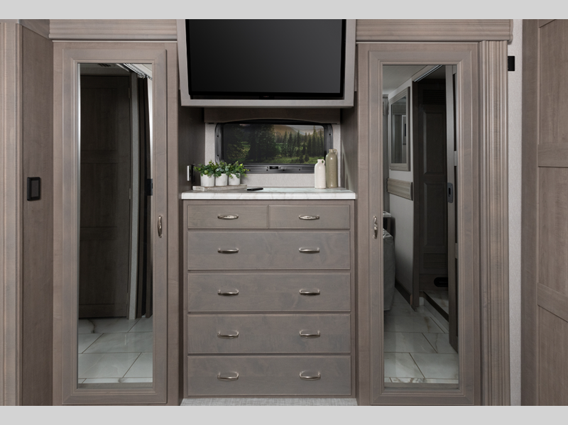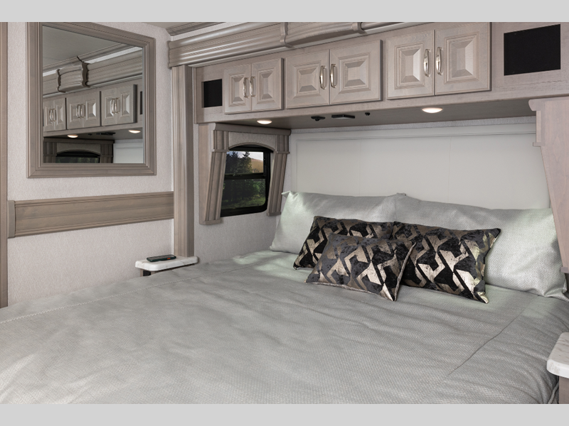 Sleeps 6 Slides 3 Length 40 ft 11 in Ext Width 8 ft 6 in Ext Height 12 ft 10 in Int Height 7 ft Interior Color Amaretto, Serenity, Anthology Exterior Color Countryside, Foundry, Gotham, Lakehouse, Reflection, Retreat, Tempest Hitch Weight 10000 lbs Fresh Water Capacity 105 gals Grey Water Capacity 75 gals Black Water Capacity 50 gals Fuel Type Diesel Engine Cummins B6.7 Chassis Freedom Bridge Freightliner XCM Series Horsepower 360 hp Fuel Capacity 100 gals Wheelbase 263 in Available Beds King Torque 800 ft-lb Refrigerator Type Residential Convection Cooking Yes Shower Size 50" x 28" Number of Awnings 2 Axle Weight Front 12600 lbs Axle Weight Rear 21000 lbs Water Heater Type Aqua Hot 400 AC BTU 45000 btu Basement Storage 142 cu. ft. TV Info LR Pop-Up LED TV, BR LED TV, Cab LED TV, Ext. LED TV Awning Info 18' Washer/Dryer Available Yes Gross Combined Weight 43600 lbs Shower Type Shower w/Seat Similar Floorplans