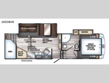 Some of the top features you'll find on these fifth wheels are an armored underbelly tank enclosure and forced air heat, an automatic leveling and stabilization system, and a Juice Pack solar system. Interior features continue on with solid surface countertops with underlighting, fully adjustable, slow rise, blackout roller shades in the main living area, and a pet friendly "Clean Sweep" floor design with no heat vents.