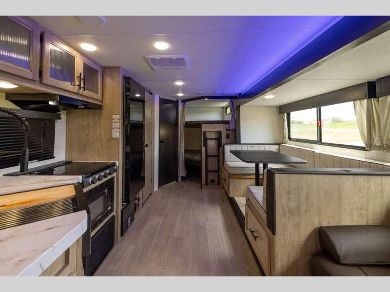 Sleeps 8 Length 29 ft 2 in Ext Width 8 ft Ext Height 10 ft 6 in Hitch Weight 605 lbs GVWR 7605 lbs Dry Weight 4425 lbs Cargo Capacity 3180 lbs Fresh Water Capacity 52 gals Grey Water Capacity 38 gals Black Water Capacity 28 gals Number Of Bunks 2 Available Beds Queen Refrigerator Type 12V High Efficiency Residential Refrigerator Size 10 cu ft Number of Awnings 1 Water Heater Type Electric Awning Info 12' Power with LED Strip Lighting Axle Count 2 Shower Type Tub/Shower Combo Similar Floorplans