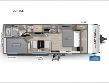 The whole family will love this travel trailer for weekend trips to the lake! When you arrive at the campground, unload the outside storage, set up the 15' patio awning, then take a hike to stretch your legs. The full kitchen with an included air fryer will let you prepare a quick lunch, and the full bath is there to freshen up each day. You will sleep soundly on the front RV king bed with a bedroom wardrobe and USB ports, while the little ones or your guests take the double-size bunk beds! There is also a booth dinette that can double as dining and sleeping space for one to two more campers; now, that's convenient!