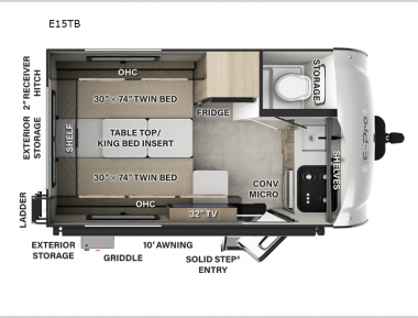Sleeps 2 Length 15 ft 8 in Ext Width 7 ft 8 in Ext Height 10 ft 1 in Hitch Weight 399 lbs Dry Weight 2833 lbs Cargo Capacity 1074 lbs Fresh Water Capacity 31 gals Grey Water Capacity 15 gals Black Water Capacity 12 gals Furnace BTU 20000 btu Available Beds Two Twin with King Insert Refrigerator Type 12V Convection Cooking Yes Cooktop Burners 3 Number of Awnings 1 LP Tank Capacity 20 lbs Water Heater Type Gas/Electric AC BTU 13500 btu TV Info 12V Smart TV Awning Info 10' Power Axle Count 1 Number of LP Tanks 2 Shower Type Wet/Bath Shower Similar Travel Trailer Floorplans