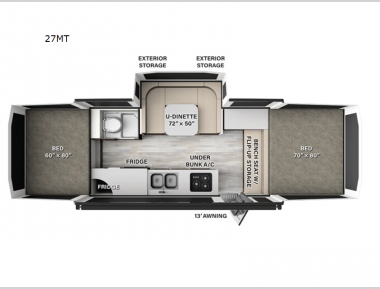 Sleeps 6 Slides 1 Length 19 ft 3 in Ext Width 7 ft Ext Height 6 ft 4 in Hitch Weight 350 lbs Dry Weight 3058 lbs Cargo Capacity 792 lbs Furnace BTU 20000 btu Available Beds Queen and King Tent End Beds Refrigerator Type 12V Cooktop Burners 3 LP Tank Capacity 20 lbs AC BTU 15000 btu Axle Count 1 Number of LP Tanks 2 Shower Type Wet/Bath Shower Electrical Service 30 amp Open Length 25 ft 9 in Similar Folding Pop-Up Camper Floorplans