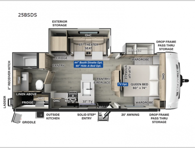 Sleeps 2 Slides 2 Length 25 ft 10 in Ext Width 8 ft Ext Height 10 ft 11 in Hitch Weight 660 lbs Dry Weight 5971 lbs Cargo Capacity 1689 lbs Fresh Water Capacity 54 gals Grey Water Capacity 29 gals Black Water Capacity 29 gals Furnace BTU 35000 btu Available Beds RV Queen Refrigerator Type 12V Cooktop Burners 3 Number of Awnings 1 LP Tank Capacity 30 lbs Water Heater Capacity 6 gal Water Heater Type Gas/Electric with Quick Recovery AC BTU 15000 btu TV Info LR 12V Smart Entertainment TV Awning Info 18' Power with Adjustable Rain Dump and LED Lights Axle Count 2 Number of LP Tanks 2 Shower Type Standard Similar Travel Trailer Floorplans