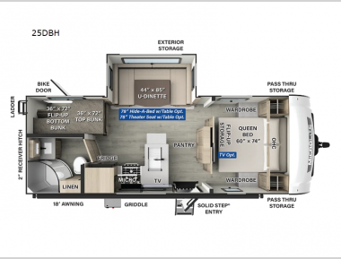 Sleeps 6 Slides 1 Length 25 ft 10 in Ext Width 8 ft Ext Height 10 ft 11 in Hitch Weight 580 lbs Dry Weight 5594 lbs Cargo Capacity 1986 lbs Fresh Water Capacity 54 gals Grey Water Capacity 29 gals Black Water Capacity 29 gals Furnace BTU 35000 btu Number Of Bunks 2 Available Beds RV Queen Refrigerator Type 12V Cooktop Burners 3 Number of Awnings 1 LP Tank Capacity 30 lbs Water Heater Capacity 6 gal Water Heater Type Gas/Electric with Quick Recovery AC BTU 15000 btu TV Info LR 12V Smart Entertainment TV Awning Info 18' Power with Adjustable Rain Dump and LED Lights Axle Count 2 Number of LP Tanks 2 Shower Type Radius Similar Travel Trailer Floorplans