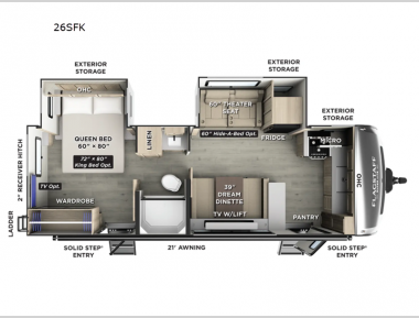 It will be so easy to enjoy time at the campground in this cozy travel trailer. The full kitchen includes a three burner gas oven, a microwave oven, and a 12V refrigerator to cook and store food, and the pantry will let you stock up on snacks. Your crew can get comfortable on the theater seat or play a game at the 39" dream dinette, and there is a smart TV with a lift here to make it a movie night. The walk-thru bath will let you freshen up each day, and the queen bed slide out in the rear bedroom is sure to bring comfort. You will also find one of the dual entry doors here for convenience plus a wardrobe for clothes storage and an optional TV if you want to add a television. The exterior is just as accommodating with its pass-thru storage, 2" receiver hitch, and 21' power awning!