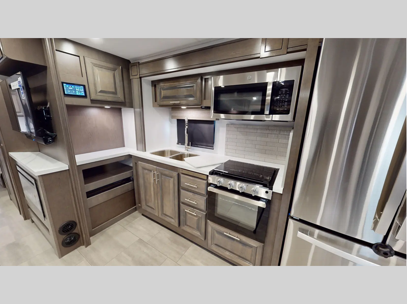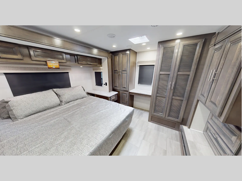 A MORryde 1.5 steel truss chassis up-fit holds them together and a hydraulic 4-point leveling system keeps them level wherever you go. If you desire to go off the grid, then you will appreciate the solar panel and 6,000-watt Yamaha generator. With a Sony 10" in-dash touchscreen radio you can play your favorite tunes, and the color side and rear cameras will make parking at the campsite easier than ever. There are also raised panel solid wood cabinet doors, spacious galleys, and plenty of storage space throughout for your belongings.