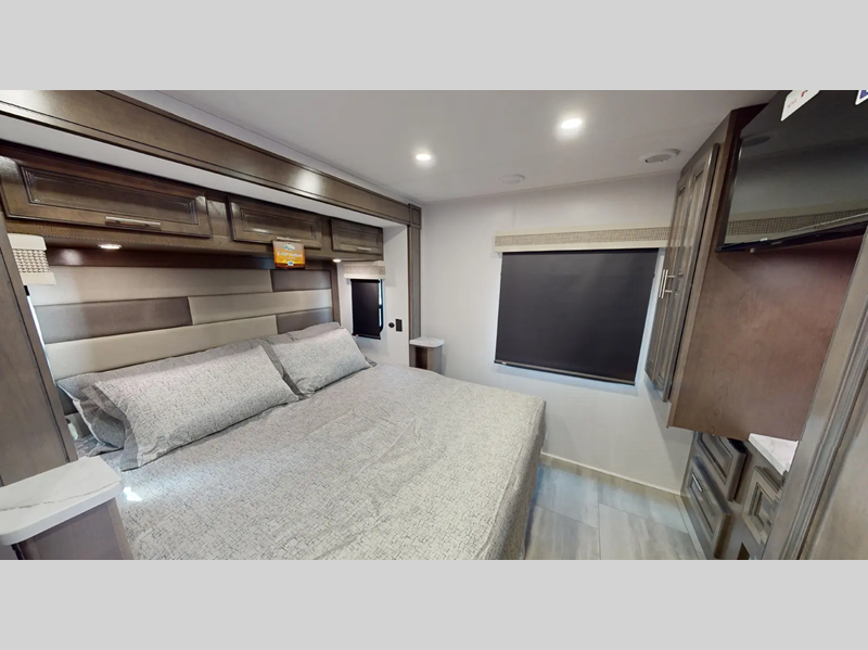 Sleeps 4 Slides 3 Length 37 ft 11 in Ext Width 8 ft 4 in Ext Height 12 ft 9 in Int Height 6 ft 10 in Exterior Color Carolina, Indigo, Poppy, Titanium Hitch Weight 5000 lbs GVWR 22000 lbs Fresh Water Capacity 80 gals Grey Water Capacity 52 gals Black Water Capacity 52 gals Furnace BTU 35000 btu Generator 6,000W Yamaha Fuel Type Gasoline Engine 7.3L V8 Chassis Ford F53 Horsepower 350 hp Fuel Capacity 80 gals Wheelbase 242 in Number Of Bunks 1 Available Beds King Torque 468 ft-lb Refrigerator Type Stainless Steel 3 Door Residential Refrigerator Size 18 cu ft Cooktop Burners 3 Number of Awnings 1 Axle Weight Front 8000 lbs Axle Weight Rear 15000 lbs LP Tank Capacity 24.5 Gal Water Heater Capacity 6 gal AC BTU 30000 btu TV Info LR 40" LED TV, BR 32" LED TV, Exterior 40" LED TV Awning Info 18' Encased Power with LED Lights Washer/Dryer Available Yes Gross Combined Weight 26000 lbs Shower Type Shower w/Seat Electrical Service 50 amp Similar Floorplans