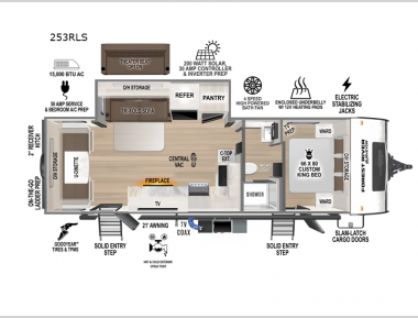 Sleeps 5 Slides 1 Length 31 ft 9 in Ext Width 8 ft Ext Height 11 ft 3 in Hitch Weight 815 lbs Dry Weight 6368 lbs Cargo Capacity 1447 lbs Fresh Water Capacity 40 gals Grey Water Capacity 40 gals Black Water Capacity 30 gals Available Beds Custom King Refrigerator Type 12V Black Glass Refrigerator Size 10 cu ft Number of Awnings 1 Water Heater Type Tankless AC BTU 15000 btu TV Info LR HD TV Awning Info 21' Electric with LED Lights Axle Count 2 Shower Type Standard Electrical Service 50 amp Similar Travel Trailer Floorplans