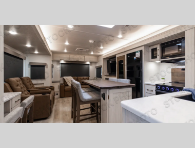 If comfort is what you're looking for, you won't have to search far with this travel trailer! There are dual opposing slides in the main living area for maximum space. The kitchen that flows from the living room area features a high-top dinette that gives a more residential feel to this space, plus there is a pantry, overhead storage, a 10 cu. ft. 12V black glass refrigerator, and more kitchen features you are sure to love. The rear living area includes an EZ-out sofa bed to provide sleeping space for two overnight guests, and there is a theater seat across from the fireplace and HD TV. You'll also enjoy a refreshing drink at the bar top that can also function as a desk! When it's time to call it a night, you can clean up in the spacious full bath, then head to the front bedroom. There is a custom king bed here along with two wardrobes and overhead storage that makes organizing easy!