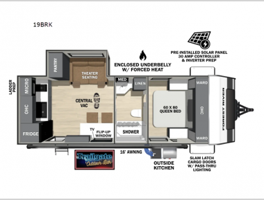 Sleeps 2 Slides 1 Available Beds Queen Cooktop Burners 2 Number of Awnings 1 Water Heater Type On Demand Tankless AC BTU 15000 btu TV Info 12V TV Shower Type Standard Similar Travel Trailer Floorplans