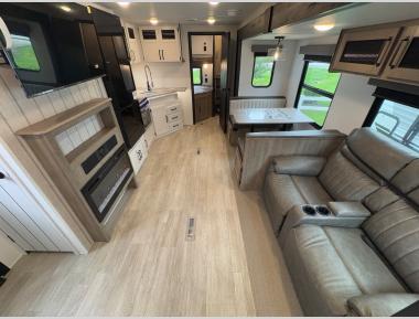 Camping with a larger group is easier than ever in this spacious travel trailer. The rear bunkhouse includes double-size bunks and a closet for your guests, and the front master bedroom includes a queen bed with dual shirt closets. The walk-through bath is easily accessible for everyone, and the main living area will be a favorite place to hang out with its sofa and booth dinette. And the fireplace here will provide even more comfort. All of your meals can be prepared in the stainless steel oven and range or in the microwave oven, and leftovers can go back in the 12V refrigerator and entryway closet/pantry!